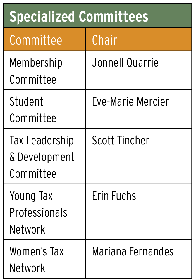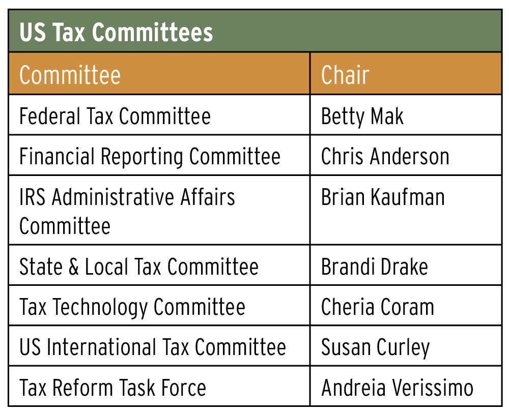 Below are TEI’s current standing tax committees and committee chairs. I encourage every member—and members of your teams—to become actively involved. Committee participation is an excellent way to expand your technical expertise, share your experience, and contribute to TEI’s mission of leadership in tax policy and practice.